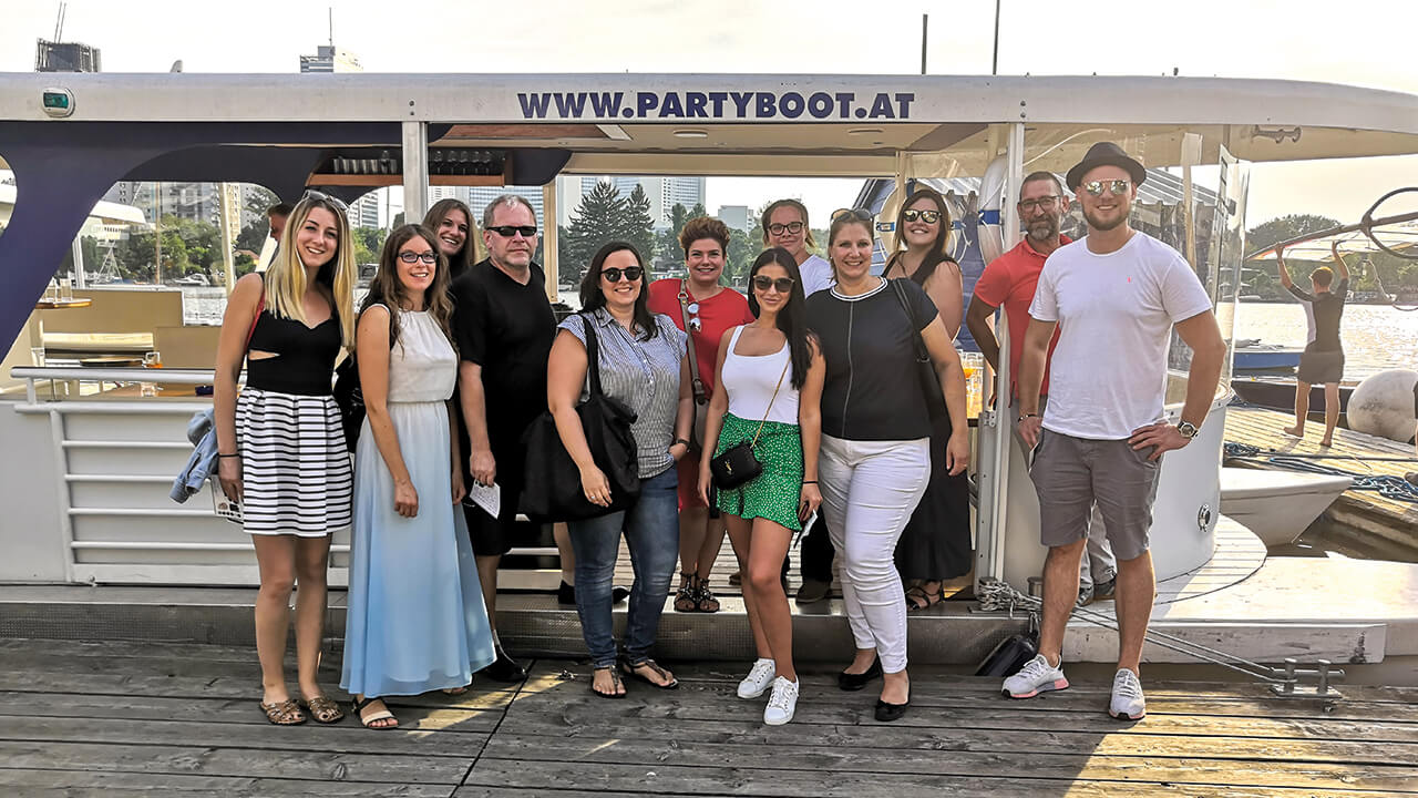 Aber jetzt möchte ich Dir nicht länger unser geniales Event zu 15 Jahren Purpur Media vorenthalten: Wir haben einen wunderschönen Nachmittag auf der Alten Donau verbracht und sind mit ausgezeichneten Essen und reichlich Getränken auf dem Partyboot von Andrea Hofbauer versorgt worden. Die nette Crew hat uns an diesem sonnigen Sommernachmittag nicht nur die versteckten Geheimnisse der Alten Donau gezeigt, wir haben gleichzeitig unseren Zusammenhalt im Team gestärkt und eine Menge Motivation mit in den Alltag gebracht.